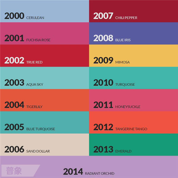 自2000年起,Pantone色彩实验室(Pantone Color Institute)每年都会选出一个最能够表达当年大众色彩取向的颜色。Pantone认为年度流行色可以最好地反映出这一年人们所渴望,和所感受到的。它也许并不是当季最潮的颜色,但却能够跨越各个领域,替消费者传达出他们的心情和态度。